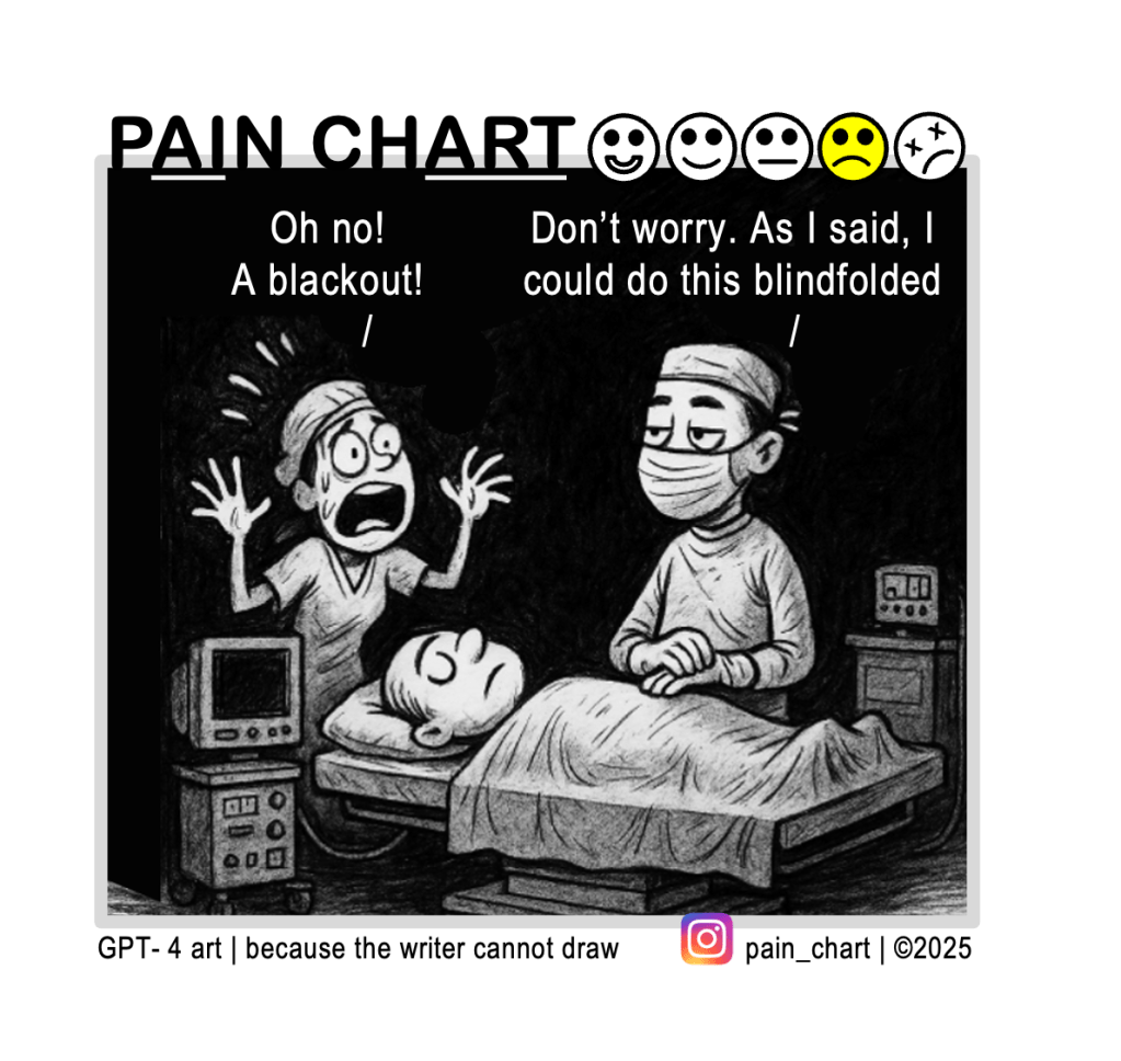Pain Chart Scalpel. Suction. Posted on October 14, 2025 by DL Shirey in Pain Chart #659 | about | more Share this: Click to share on X (Opens in new window) X Click to share on Facebook (Opens in new window) Facebook Like Loading...