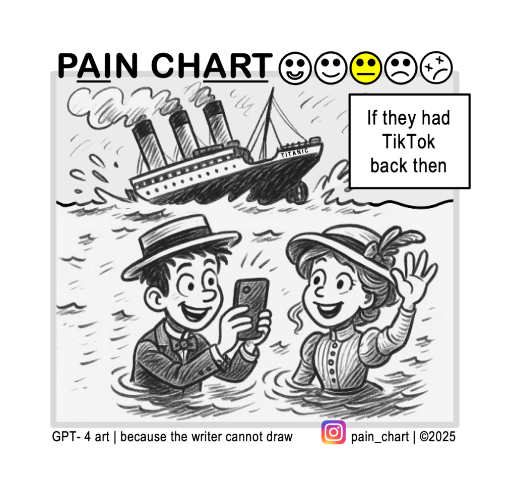 Pain Chart My Heart Will Go On Posted on November 5, 2025 by DL Shirey in Pain Chart #677 | about | more Share this: Click to share on X (Opens in new window) X Click to share on Facebook (Opens in new window) Facebook Like Loading...