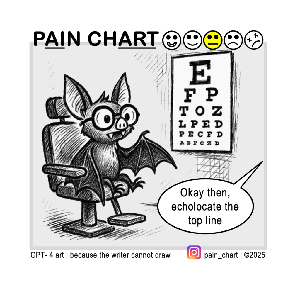 Pain Chart Bat an Eye Posted on November 20, 2025 by DL Shirey in Pain Chart #690 | about | more Share this: Click to share on X (Opens in new window) X Click to share on Facebook (Opens in new window) Facebook Like Loading...
