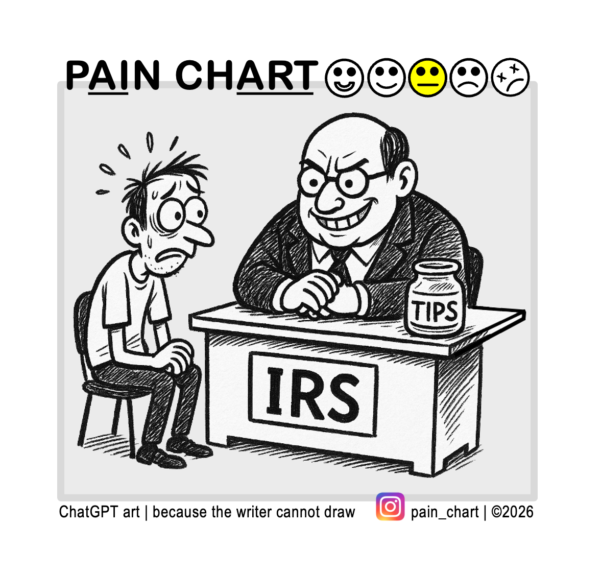 Pain Chart It’s Tax Day Posted on April 15, 2026 by DL Shirey in Pain Chart #834 | about | more Share this: Share on X (Opens in new window) X Share on Facebook (Opens in new window) Facebook Like Loading...