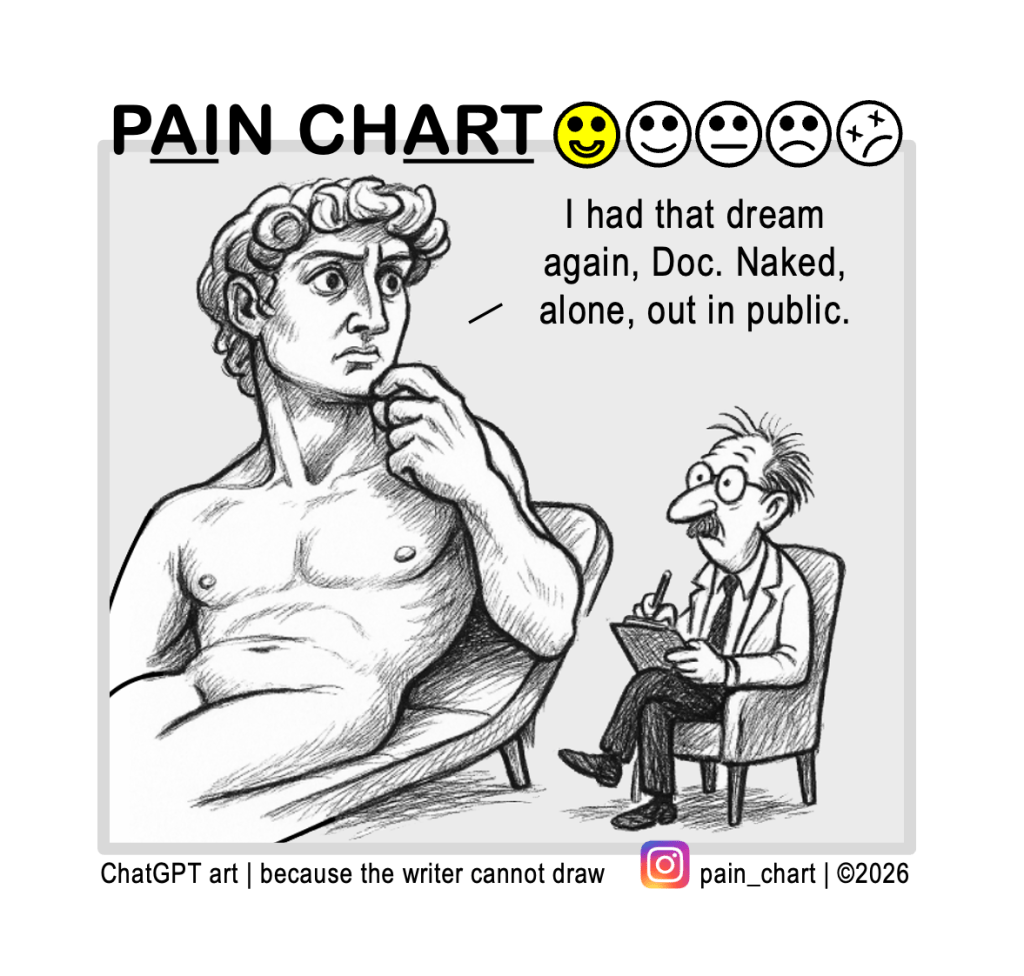 Pain Chart Dream on Posted on April 20, 2026April 14, 2026 by DL Shirey in Pain Chart #839 | about | more Share this: Share on X (Opens in new window) X Share on Facebook (Opens in new window) Facebook Like Loading...
