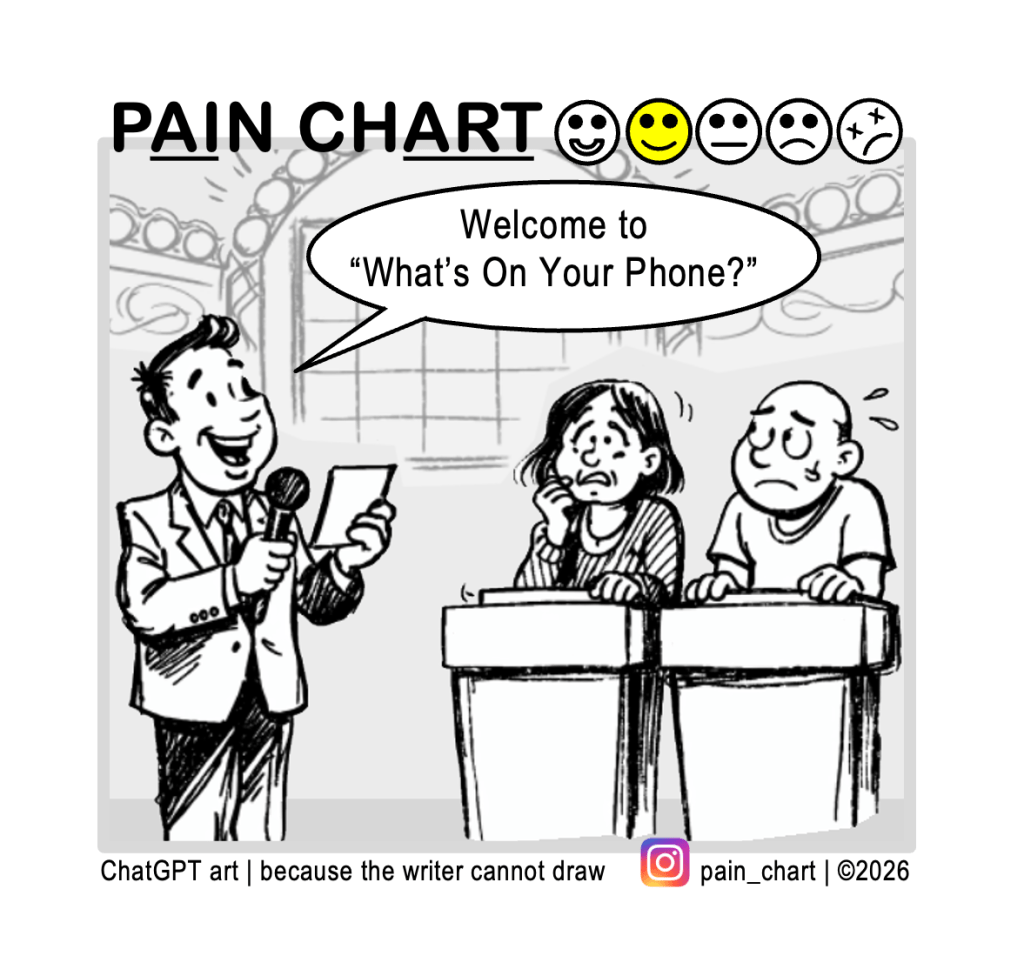 Pain Chart Game Show Posted on April 23, 2026 by DL Shirey in Pain Chart #842 | about | more Share this: Share on X (Opens in new window) X Share on Facebook (Opens in new window) Facebook Like Loading...