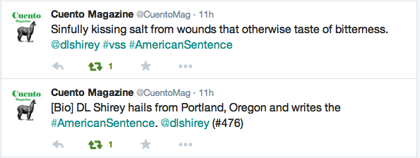 Cuento Magazine is a Twitter-based magazine of microfiction. Here’s an American Sentence of mine they published.